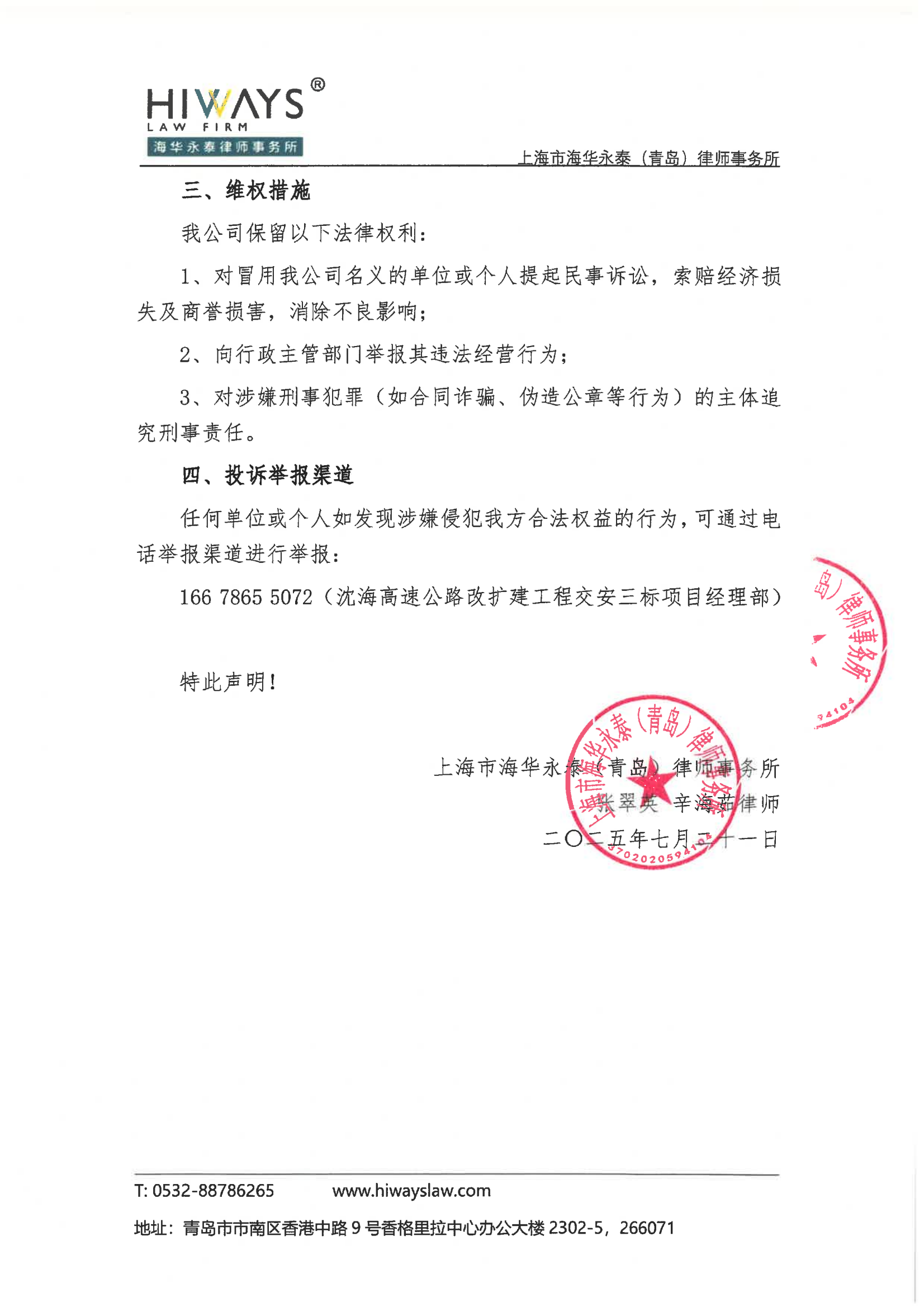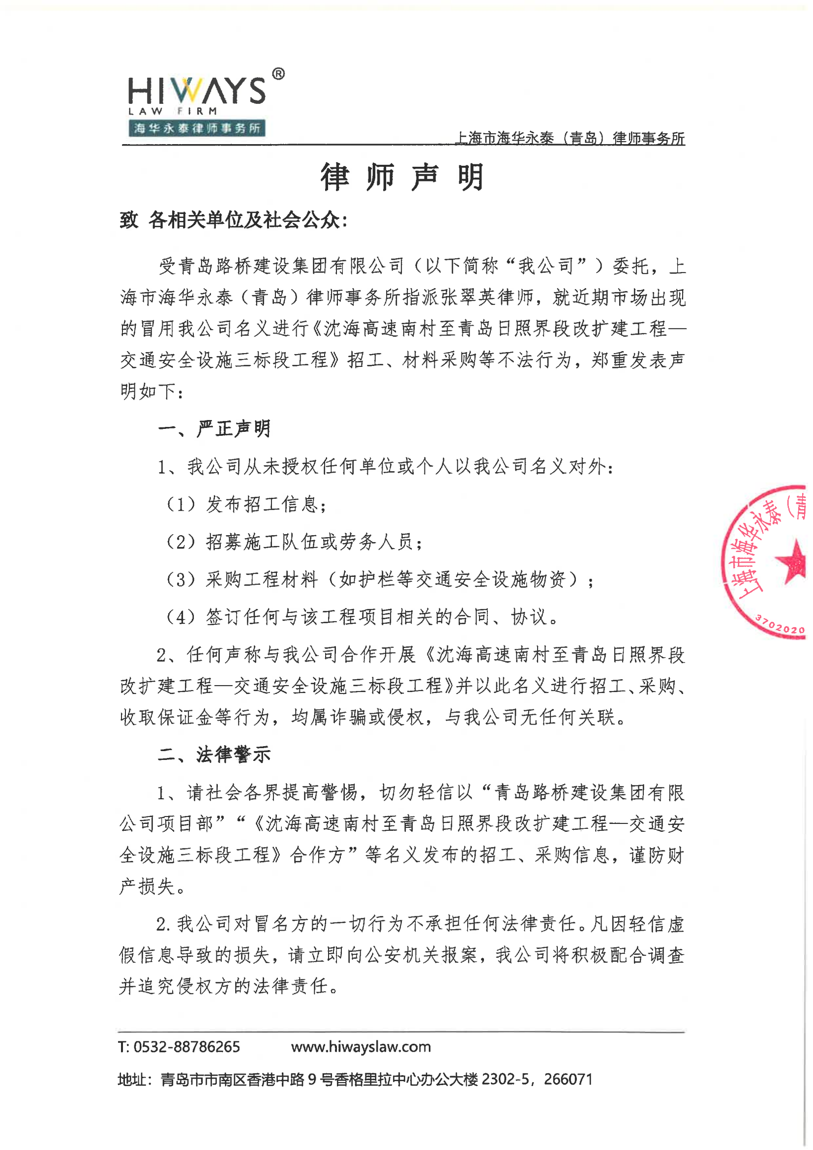 關(guān)于沈海高速南村至青島日照界段改擴(kuò)建工程—交通安全設(shè)施三標(biāo)段工程招工、材料采購等不法行為的律師聲明
